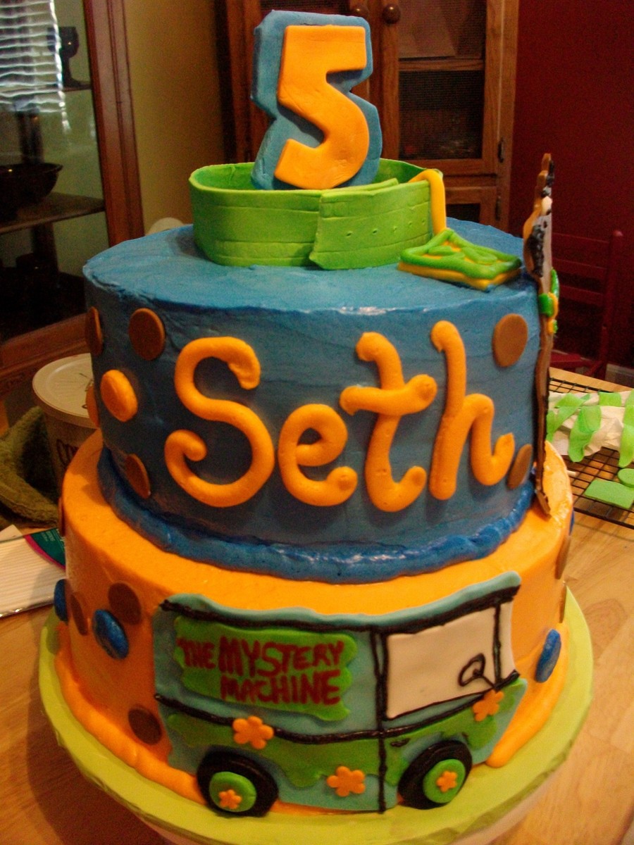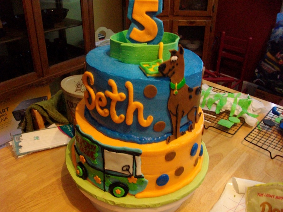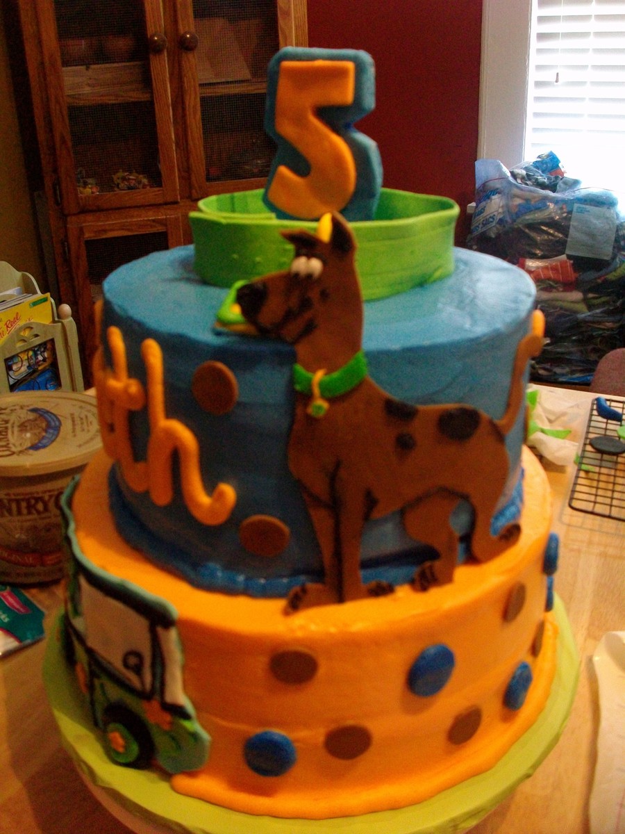Scooby-Doo two tiered round cake. Scooby and Mystery Machine are made from fondant then painted details. Dog collar is made from gumpaste.