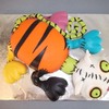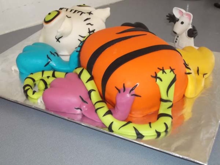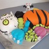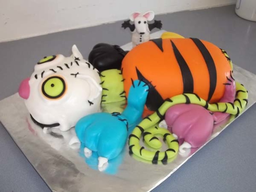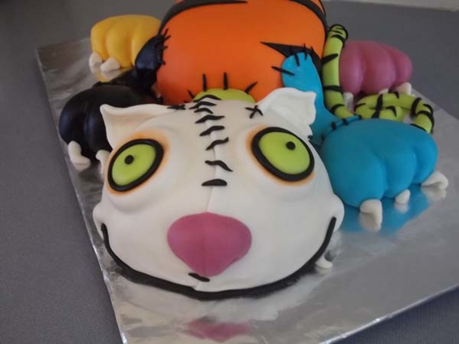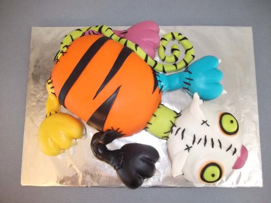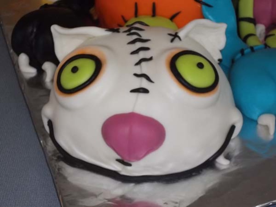 The inspiration for this cake came from a cake featured here by megscakegallery. This was made as a birthday cake for a friend who absolutely loves Halloween and cats. This gave her the best of both as far as she was concern! I used the Durable Cake for 3D and Wedding Cakes recipe from here as well. Cake interior colors were neon pink, bright orange and neon green. The cake is covered in marshmallow fondant. Dr. Frankencat is made of gumpaste. This was my first time using fondant under fondant for molding features, which fun to do. The head is not carved as well as it should have been, but I am still learning. Anyway, I took a lot of pictures while constructing it, but oddly enough I forgot to take one with the neck bolts that went on last! Hopefully I can get a good one from my friend to post later.