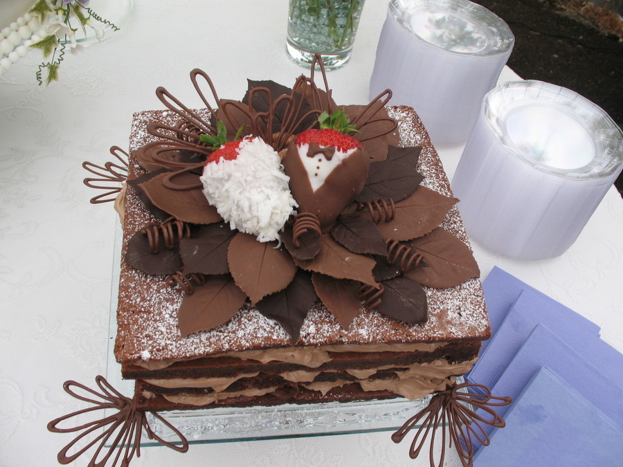 groom wanted a chocolate cake that you could eat with your eyes. Recipe has 3.5 lbs chocolate 2.5 lbs butter and 2 dozen eggs.