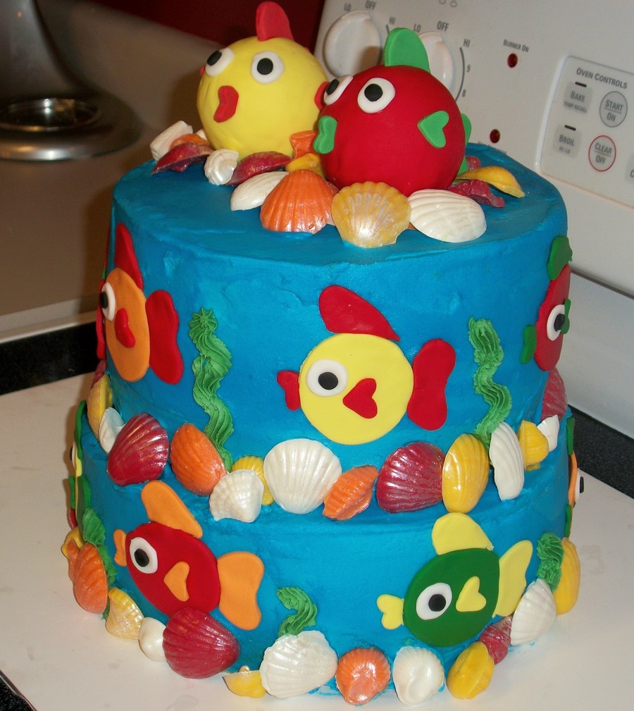 For a 1st birthday with a smash cake. White cake with buttercream icing, fondant fish, and chocolate shells with pearl spray.