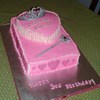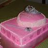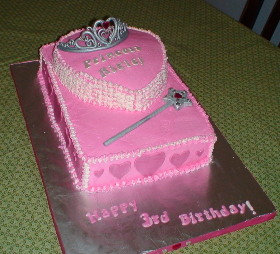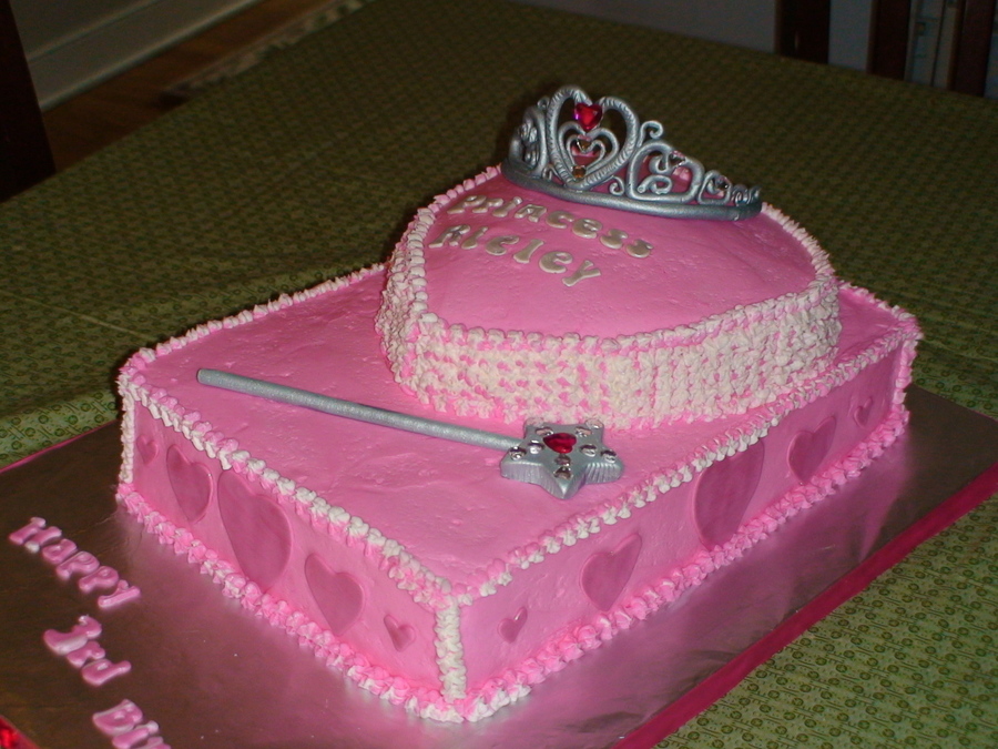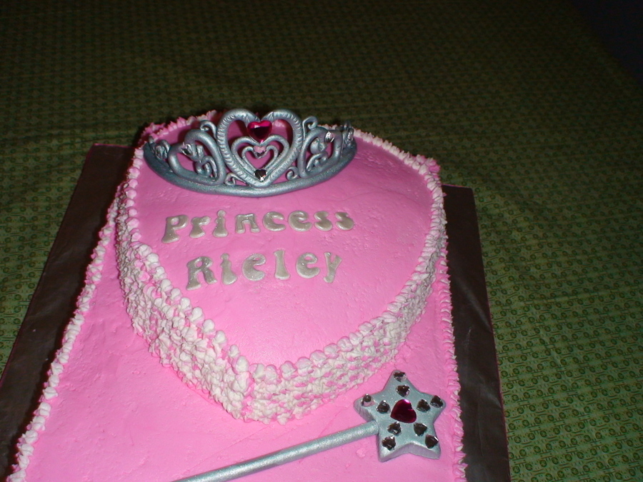 Hand made Tiara and wand. This bottom cake is 9/13 I think, and the top is 8" heart. Buttercream with fondant accents.