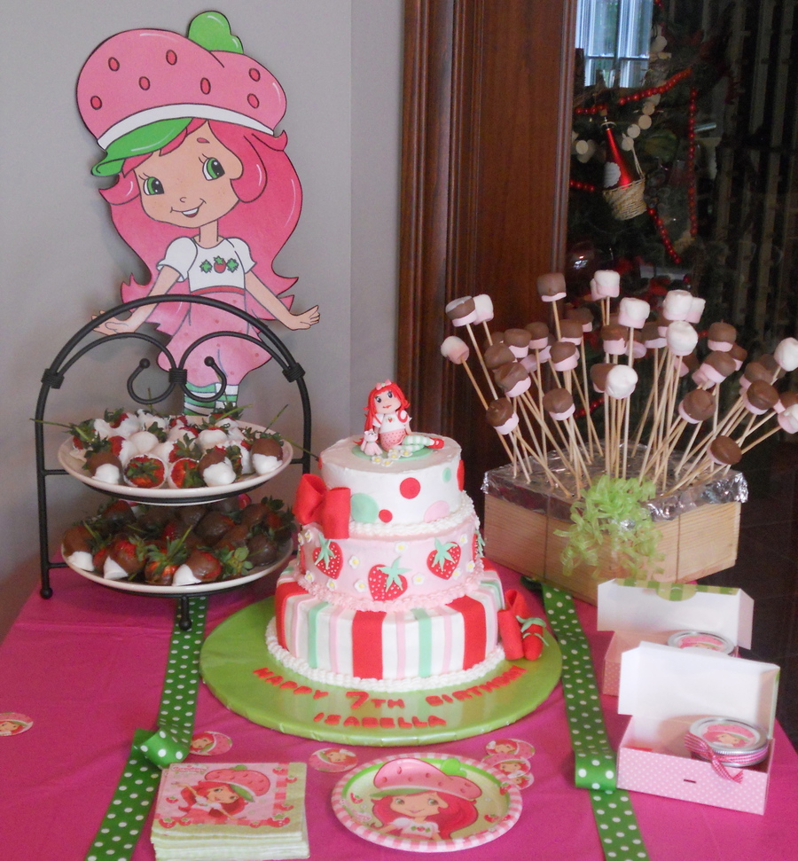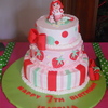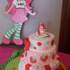 I made this Strawberry Shortcake cake, inspired by the many found on this site. Phew, glad this one is done! Bottom layer is white cake with strawberry filling, middle is chocolate with whipped ganache filling, and top is lemon with lemon curd filling. Buttercream icing and fondant decorations; handmade gum-paste Strawberry Shortcake and Custard. TFL!