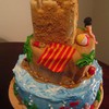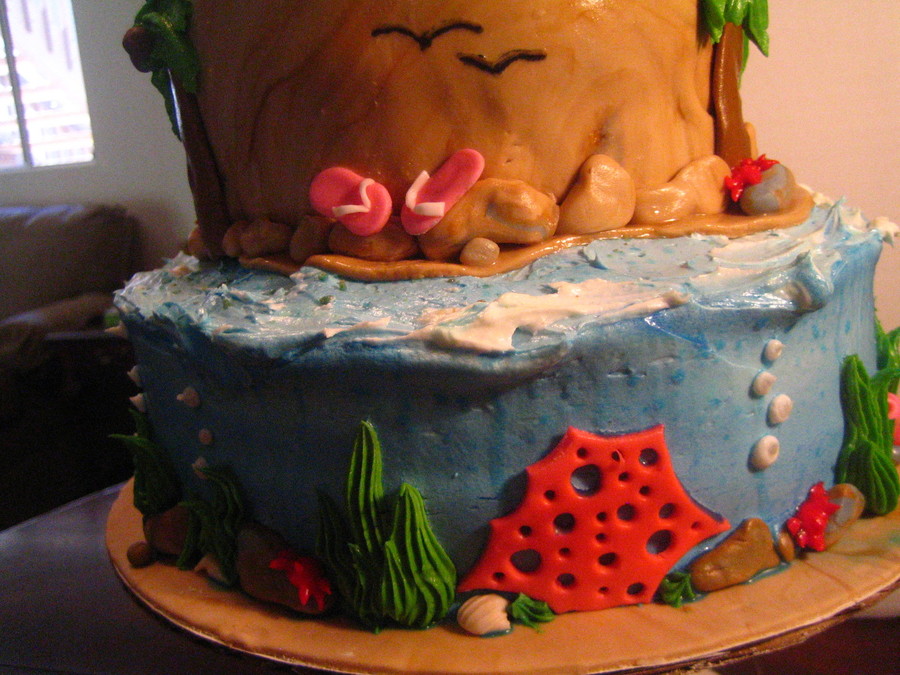 The sand castle is a sugar cookie covered in graham cracker. Top layer is fondant, bottom is buttercream. All details are fondant.