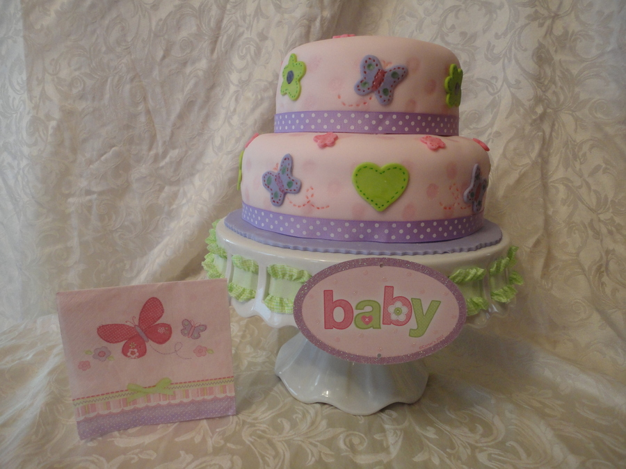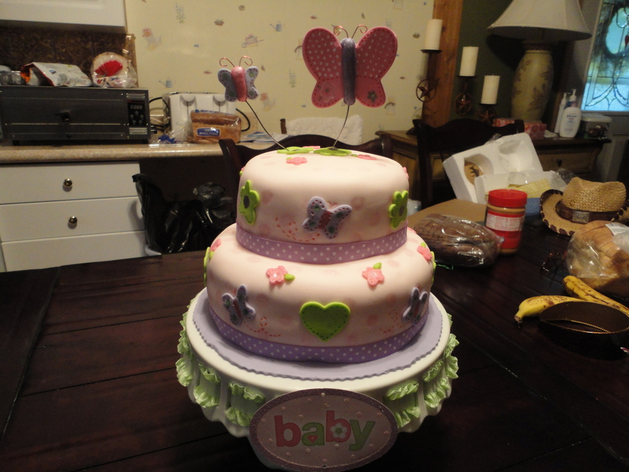 Baby shower cake made to match decorations. Will add a better picture of the cake with the butterflies on top when I get one. tfl :)