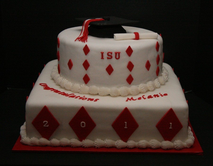 Bottom is 14" triple choc with oreo filling. Top is red velvet with white choc filling. Covefred in fondant. Graduation cap,, tassle and diploma in gumpaste/fondant.
