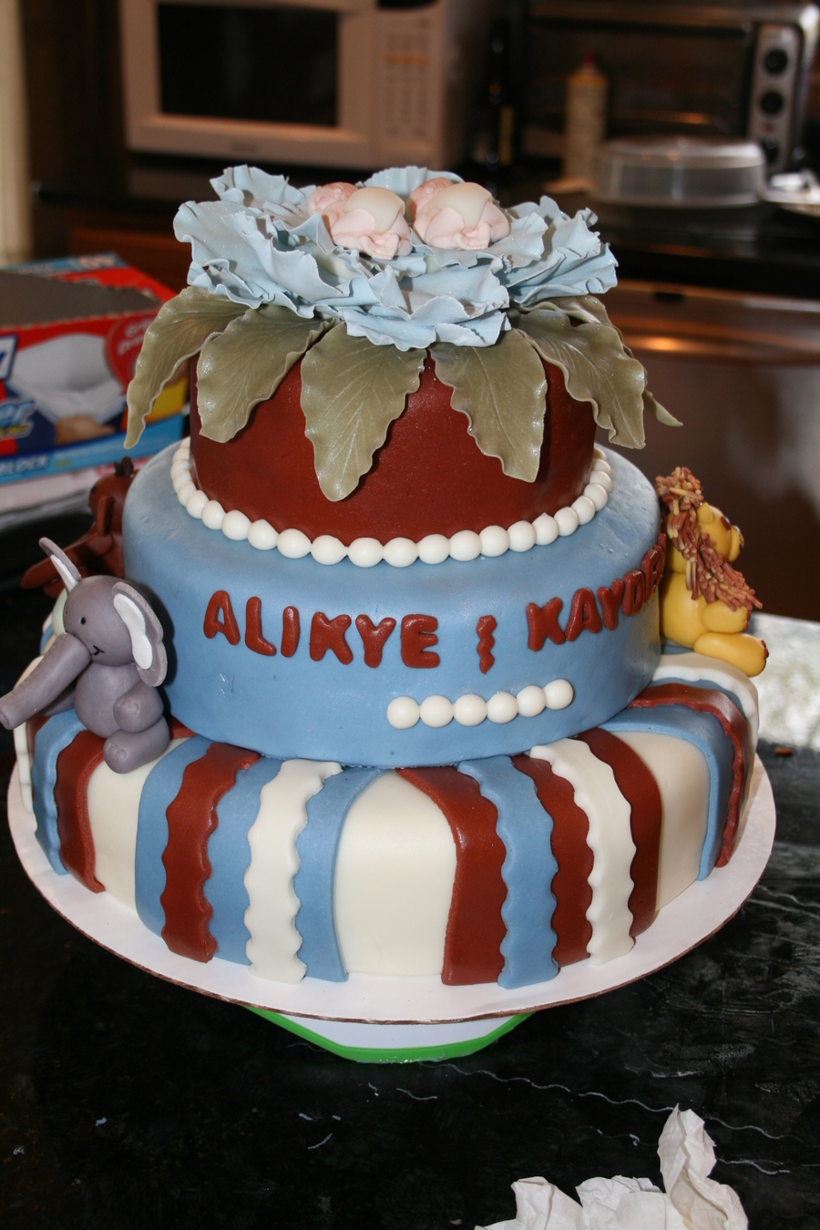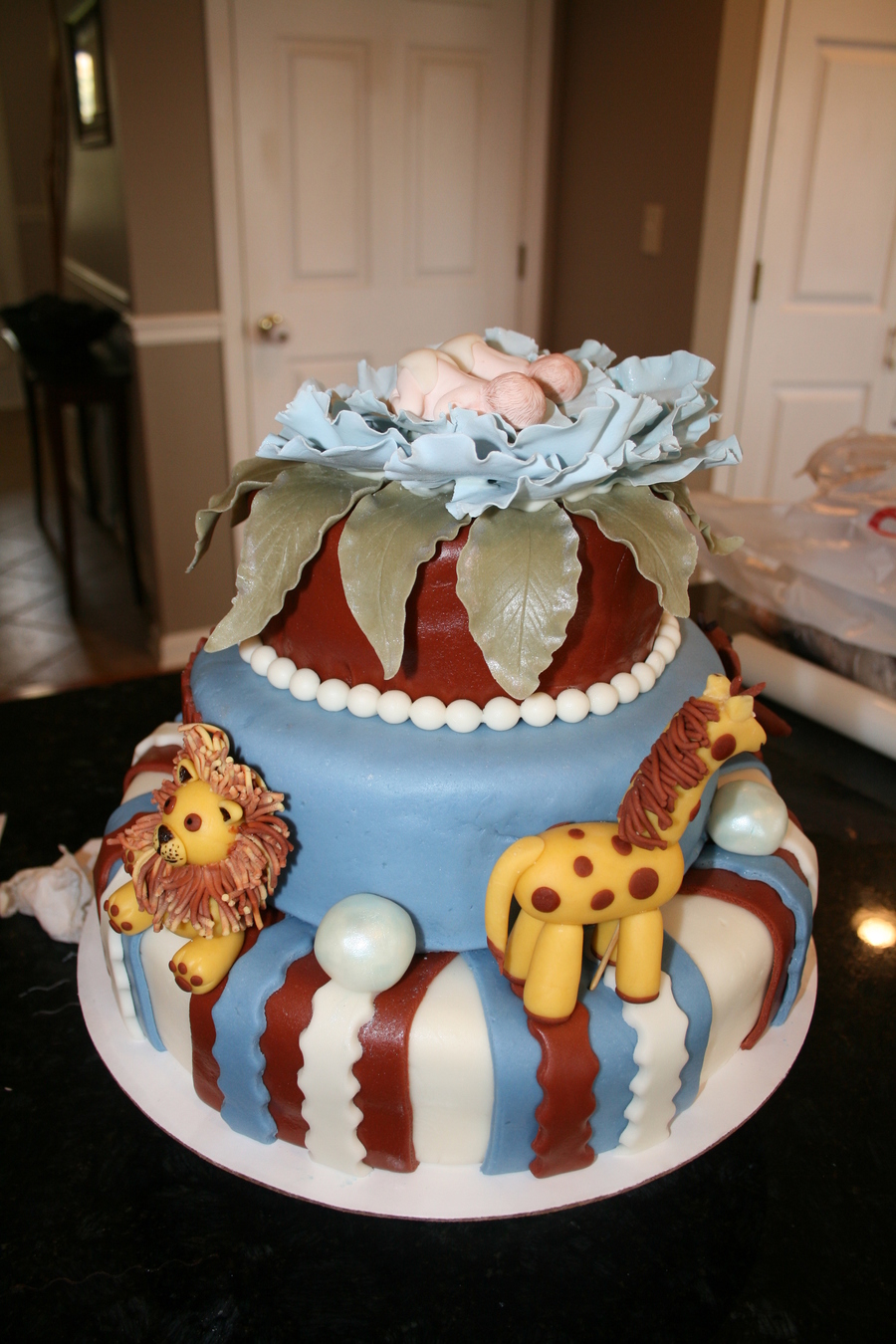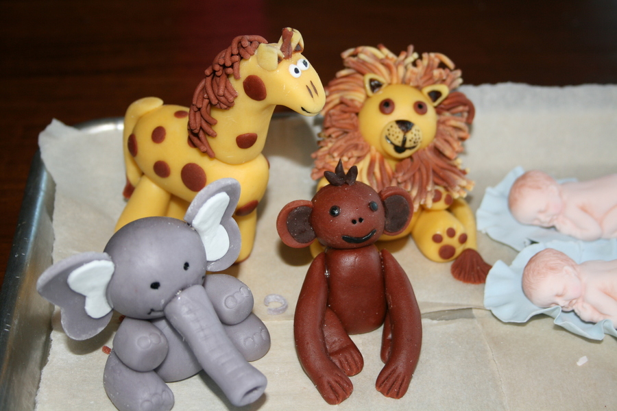 Jungle nursery theme. Ist baby shower cake I have made (also my 5th cake so far) Hand molded all 4 animals. 12in , 8in and 4in cakes.