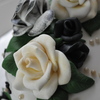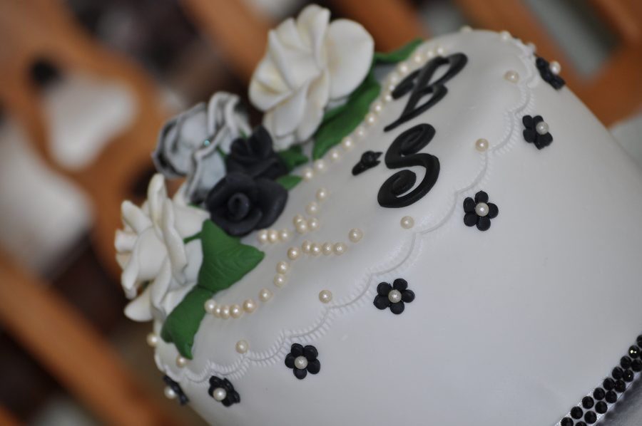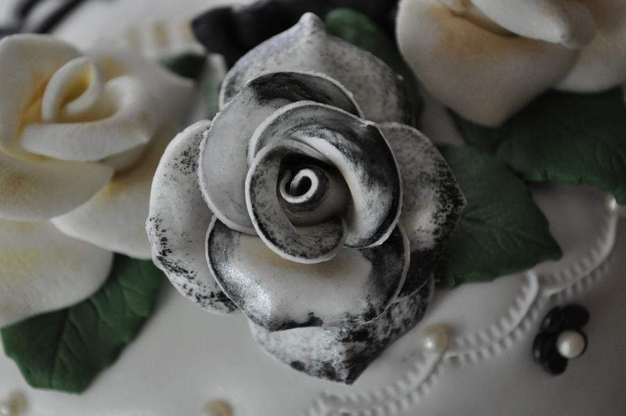 Made for our cousins' first wedding anniversary. Inspiration from the brides dress and roses in her hair. Everything is edible except ribbon border. This was my first time attempting fondant roses of this size and I LOVE how they came out. I used a little petal and luster dust to enhance the color. Also tried out my crimping technique again. TFL!