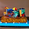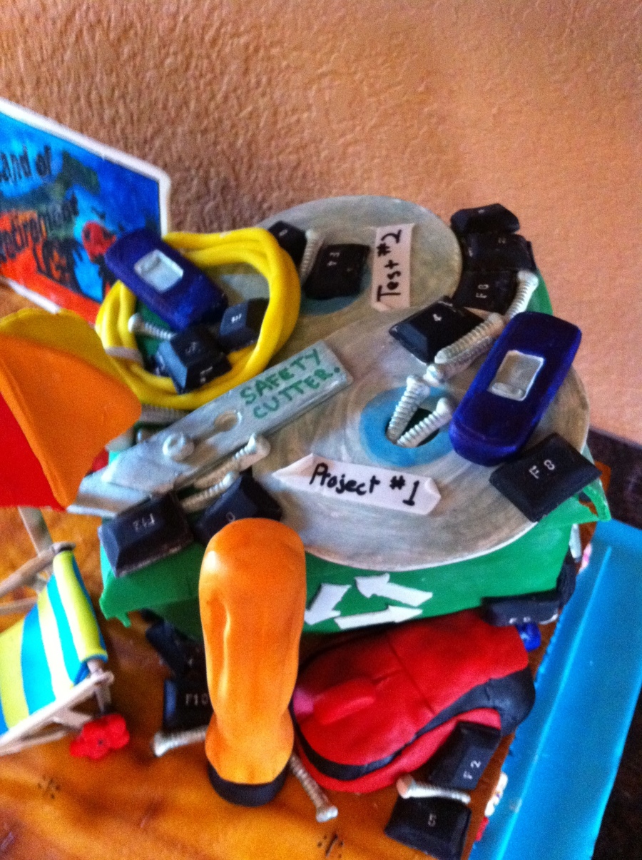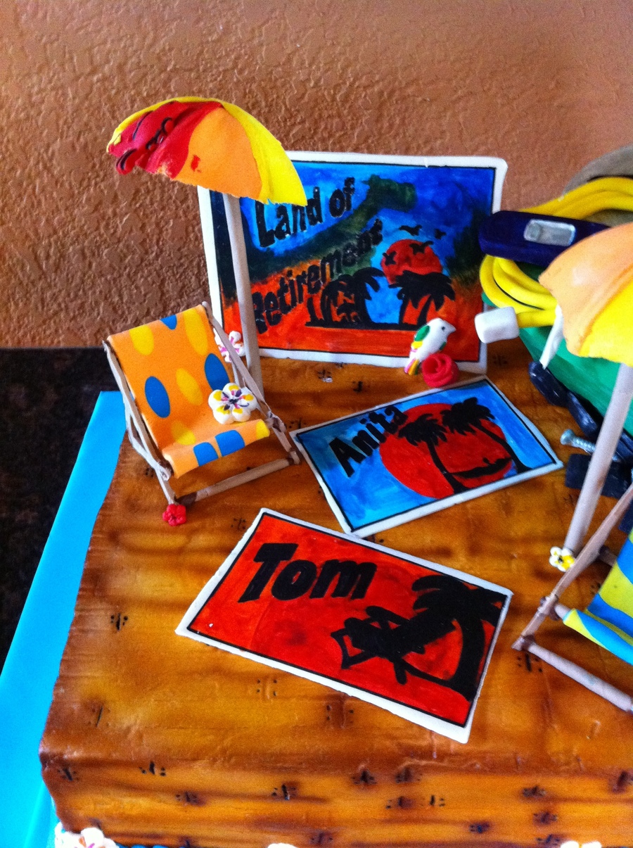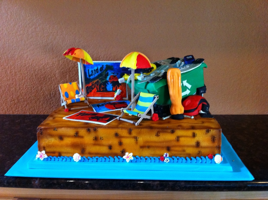 White sheet cake covered in buttercream then used an impression mat and airbrushed to look like a wooden pier. Recycle bin is cake covered in fondant. Chairs, umbrella, postcards, billboard and all the computer stuff is sugarpaste. TFL