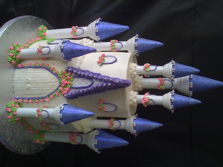 Castle cake is iced in buttercream with royal icing accents and disco dust on the turret tops. Used the Wilton Castle set. Each tier is 3 layers instead of 2 which is why I had to make a larger front door out of fondant instead of using the small door included in the castle set. White cake with cookies and cream filling and chocolate cake with chocolote fudge filling.