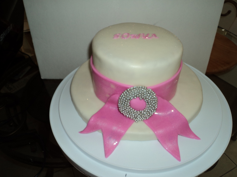 Chocolate 6in. buttercream filling,covered MMF . Brooch is Gumpaste,tylose glue plus silver dragees