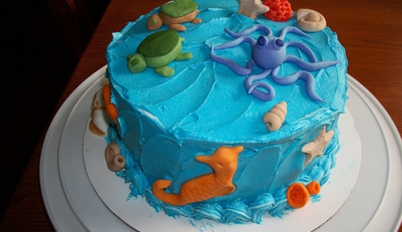 Chocolate cake with buttercream frosting and fondant flowers and lady bugs inspired by a cake on CC.