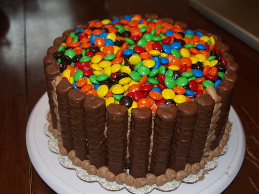 This is a brownie cake with twix and mms