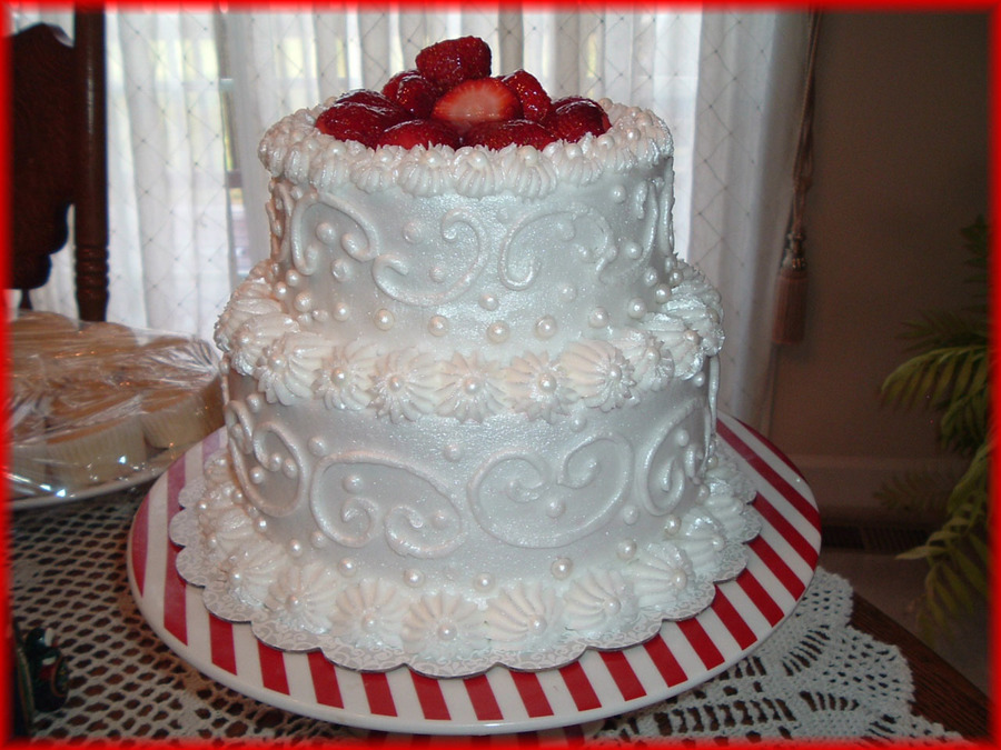 This is a small wedding cake that is sweet almond sour cream, torted and filled with strawberries and frosted with sweet almond buttercream frosting. I sprayed the frosting with pearl luster dust and topped the entire cake with sliced strawberries, glazed with a strawberry jam.