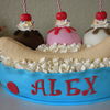 Banana split cake for my son's 3rd birthday. chocolate cake with chocolate mousse filling, and IMBC to look like whipped cream. cherries and banana are fondant. Thanks so much to Alisa555 and SweetTater for all the help and inspiration!!