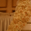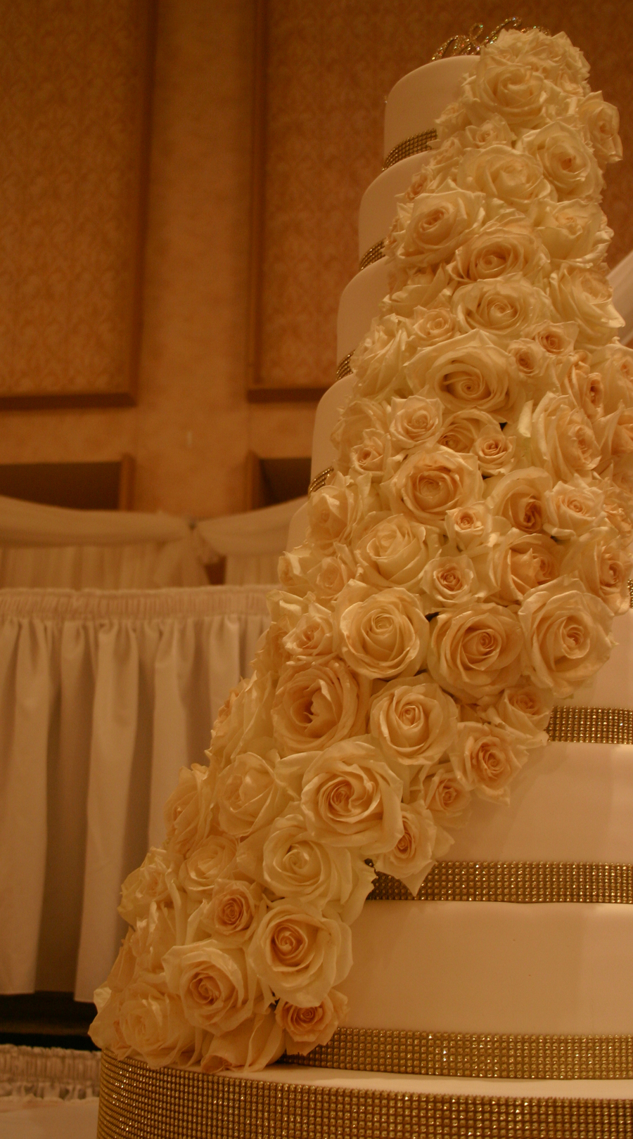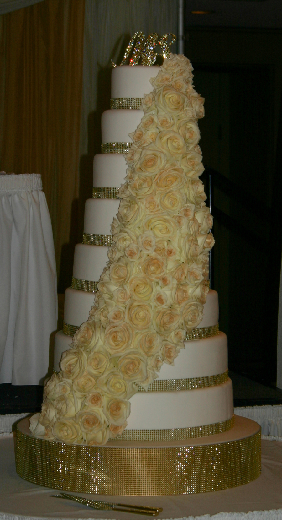 Eight layers of ALL real cake covered in fondant with 100 real roses cascading down the front that were all dusted with edible gold glitter.