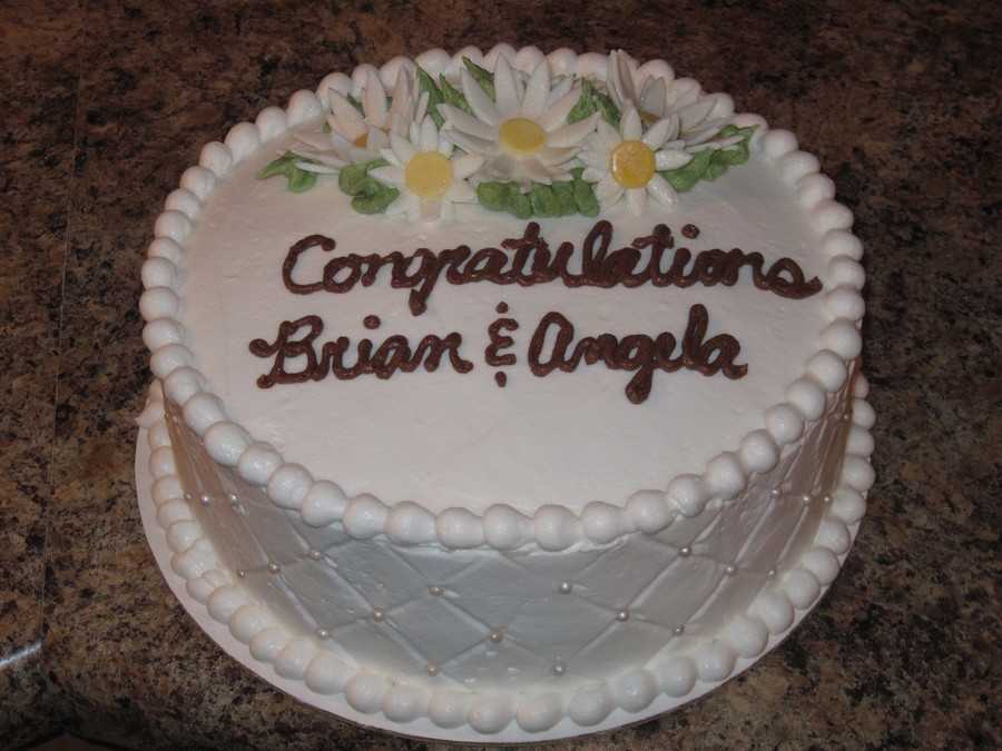 9' round covered in butter cream frosting. Used a stencil to make patchwork detail and inserted edible pearls & daisy's made out of fondant.