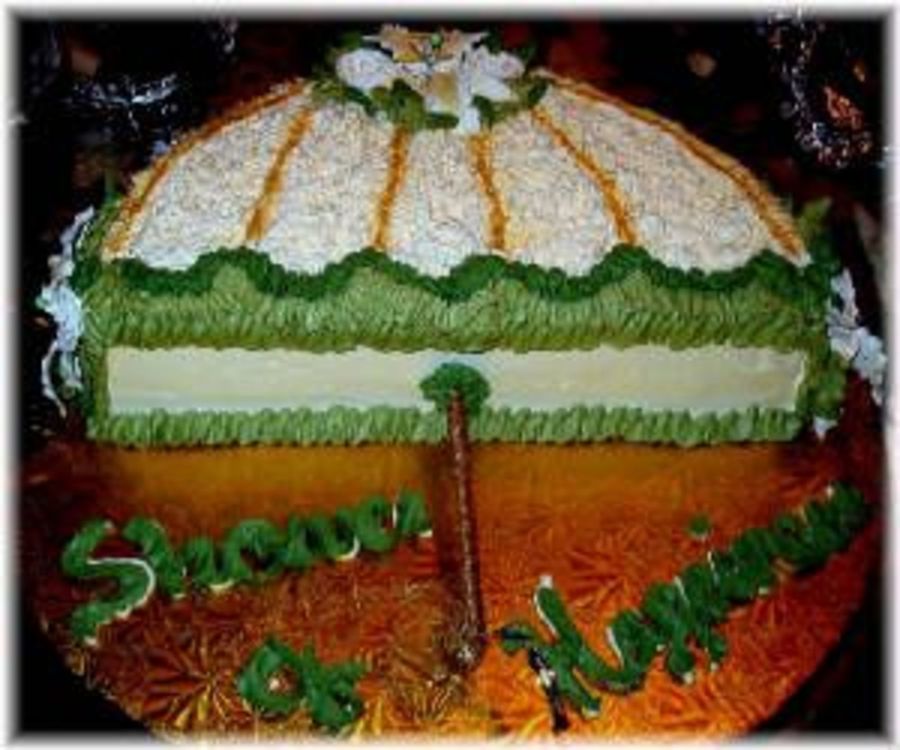 This was a 16" cake cut in half and stacked with buttercream icing and royal icing flowers. I used a lollipop stick cover with an antique gold ribbon (leaving about 2 inches w/out ribbon in order to stick it in the cake). did the same on the other for the top of the umbrella.