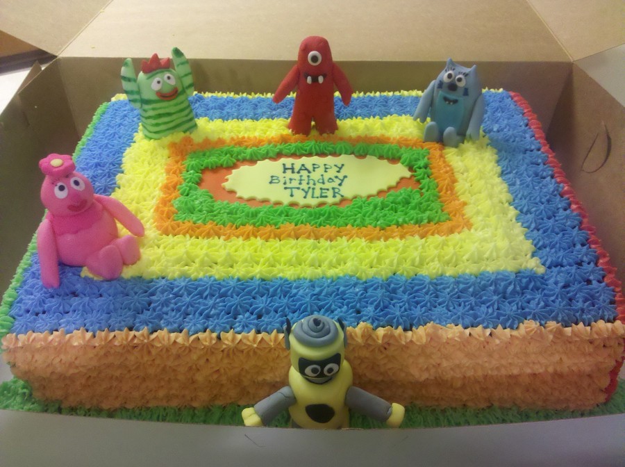 This is a Yo Gabba Gabba cake I made for a 2 year olds birthday. This is 2 11x15 sheet cakes stacked on top of each other. Yellow cake with buttercream icing. The characters are made out of fondant.
