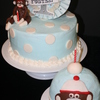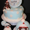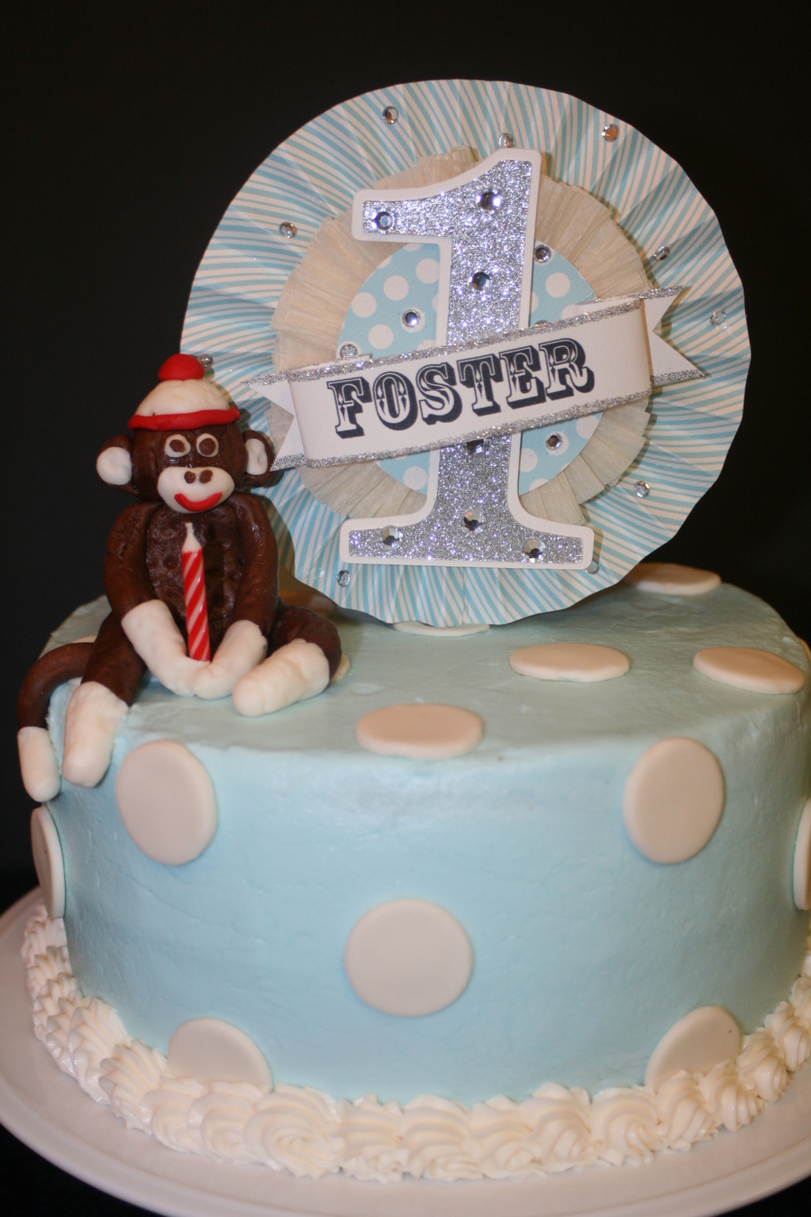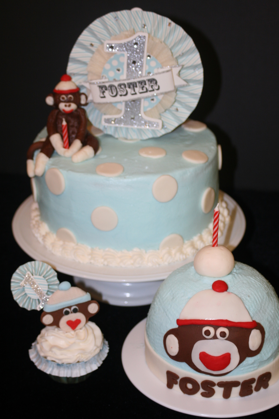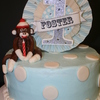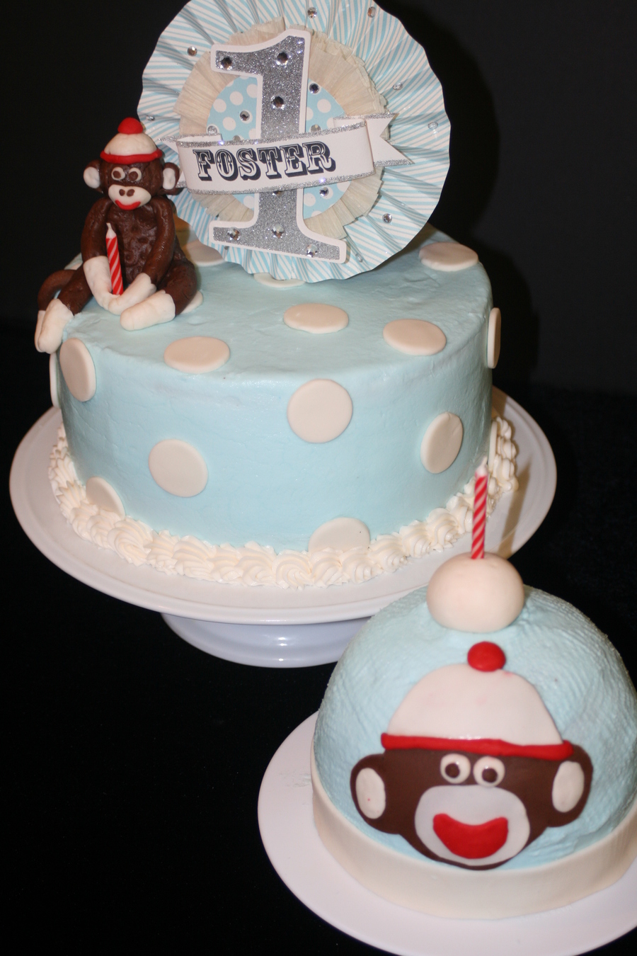 9" white cake with buttercream frosting and fondant accents. Fondant monkey on top. Paper centerpiece on top. Toboggan smash cake is chocolate with buttercream frosting and fondant accents.