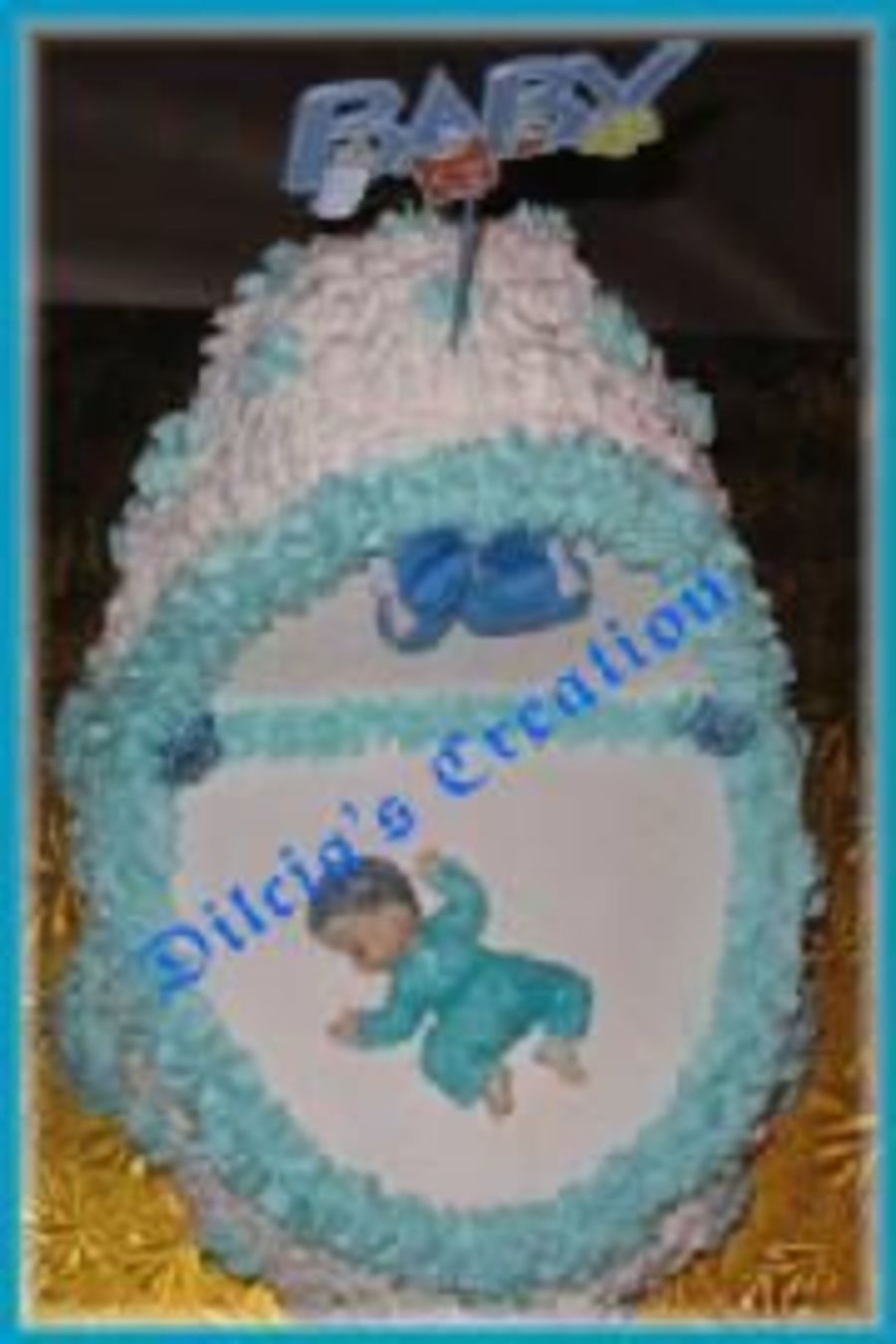 This is a 3d bassinet decorated with buttercream icing. The baby was made out of fondant. This is the best way to make a bassinet cake being that it's always hard to find something that looks like the hood of the bassinet.