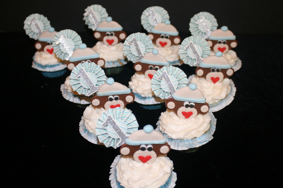 10 white cupcakes with marshmallow creme filling and 10 chocolate cupcakes with marshmallow creme filling. Buttercream frosting with fondant monkey.