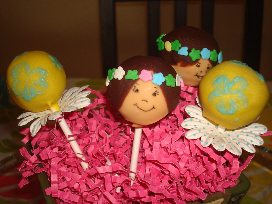 Hula girl cake pop with reg. yellow coated cake pop with hand painted flowers. Had extra cupcakes and decided to make these for my daughters. I think they turned out really cute. :)