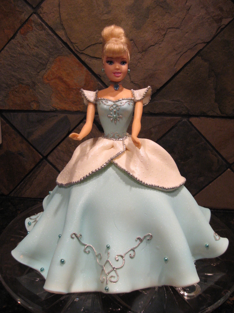 Cinderella. Every little girl wants one! There are many versions of this cake. Isn't it hard to create a cake that looks like fabric and you have to make up some of it on your own? This is my take on Cinderella. I used a Wilton doll bodice but stole the head off my daughter's Cinderella doll for the cake. (Of course I put the head back after we ate the cake!)