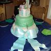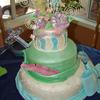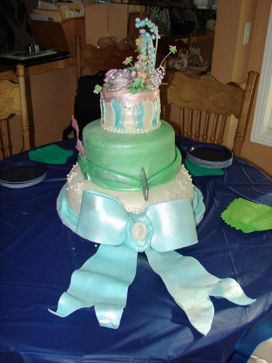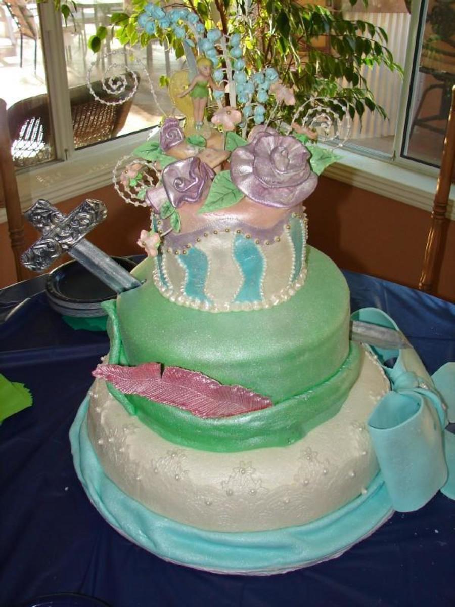 This cake was for a 17th, Peter Pan birthday party. Wendy's dress is represented in the bottom tier with lace overlays, blue sash, and cameo. The next tier is Peter's hat and sword. The top tier is Tinkerbell surrounded by flowers and perched on a mushroom.