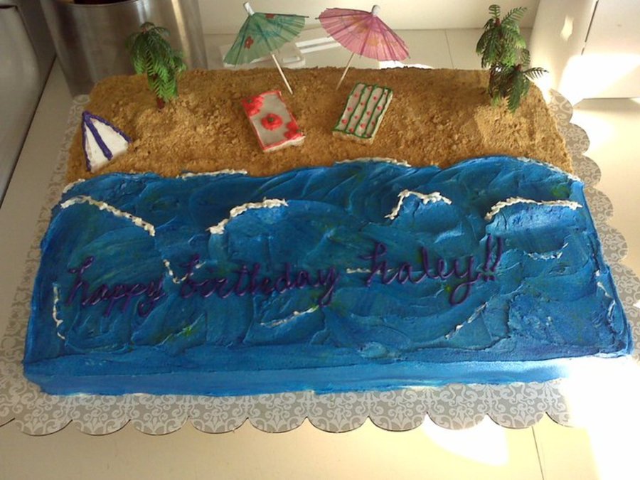 Beach theme bday. Standard half sheet. sand made with graham cracker and brown sugar. BC water with white waves. Surfboards on GP. towels are frosted 1/4 pieces of graham crackers.