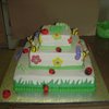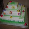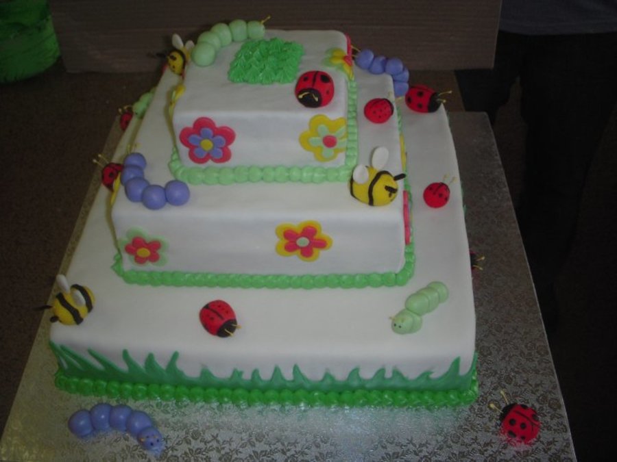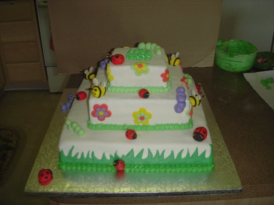 Bug cake for a coworker's daughter's first birthday. It was my first attempt at making a square tiered cake. The ladybugs and bee's are made of gumpaste and the caterpillers are MMF.