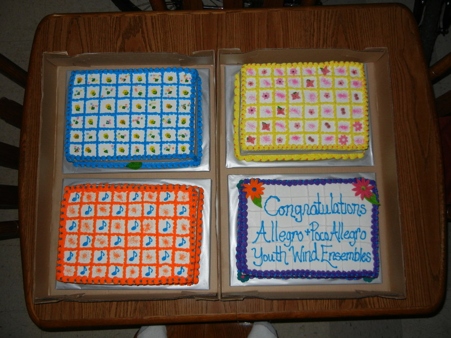 These cakes were for two band concerts. Vanilla, Chocolate, Lemon, and Red velvet. I was not there to serve them so I thought this would be the best way to decorate them for who ever ended up hacking them up! :) TFL!