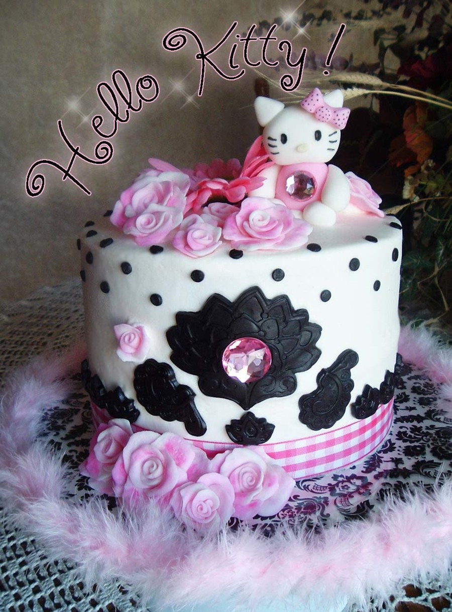 This may just possibly be one of the most delicious cakes evahhh! It is a pineapple cream cake with dulce' de leche filling and frosted with French vanilla buttercream. OoooooEeeee girl! Everything is totally edible, except for the pink daisy flower on top, the jewels and the ribbon. All of the roses, the black accents and Hello Kitty herself are made of fondant.
