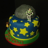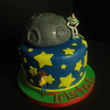 Half ball pan moon on top of an 8" round, covered in fondant. The red ribbon matched the candles that were later placed on the cake - they were stars with his age and were yellow blue, white and red. I also made coordinating cupcakes that had a blue swirl of buttercream and a yellow fondant star.