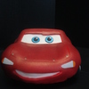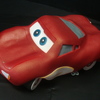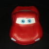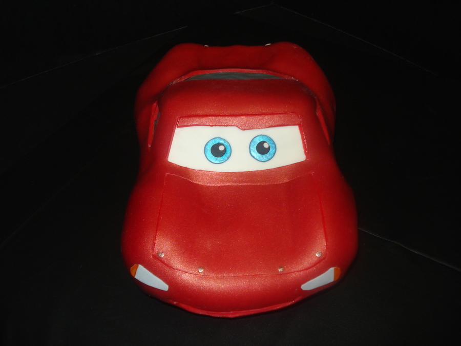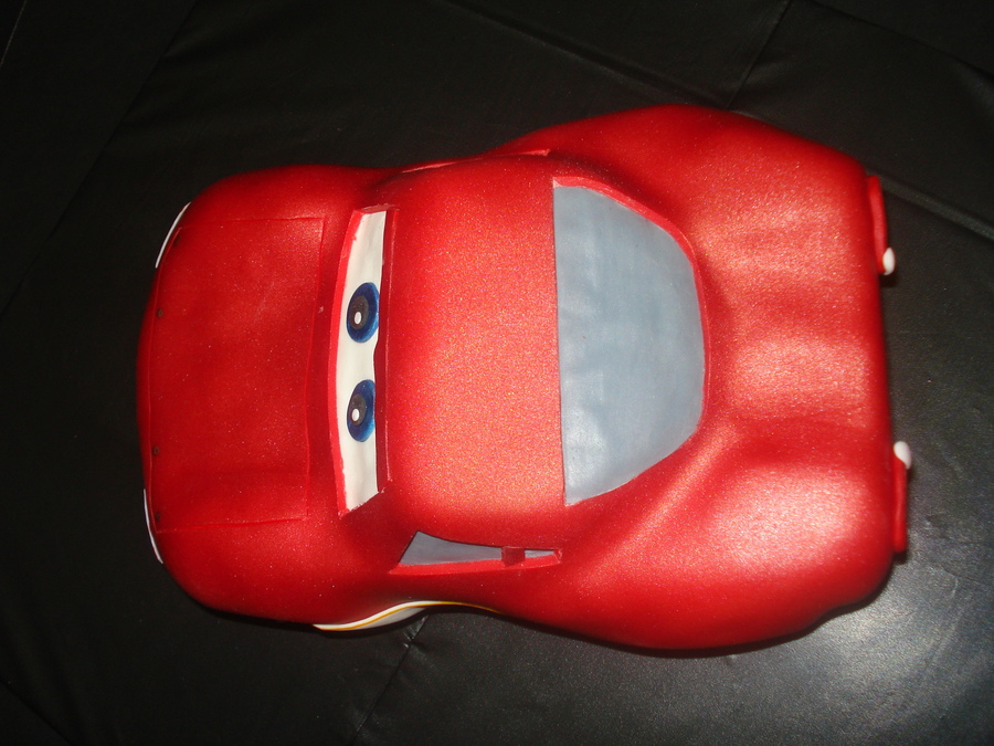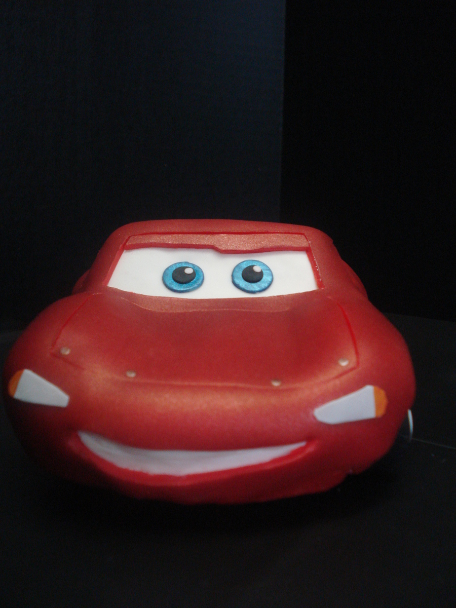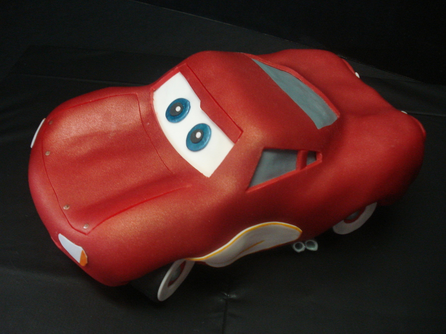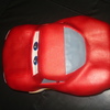 This was for our youngest nephew's birthday. This Lightning McQueen is from the first movie, when he finished fixing the road in Radiator City and shopped the town's business, getting new tires and a new paint job. We actually got it to look candy apple red and shimmery in person. I covered it in red fondant, airbrushed pearl sheen, then airbrushed red. The pearl sheen shimmers showed through. The car is all cake and the tires were cut from RKT and covered in fondant.