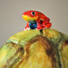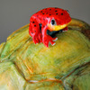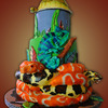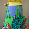 My oldest son's birthday cake! The little stinker knew exactly what he wanted, too ... drew it up (will post in a bit) and specified how he wanted the "strawberry-backed poison dart frog", as opposed to the red-eye tree frog or some other inappropriate critter, hehe. A blast to make! Chocolate cake with cookie dough filling and dark ganache at the bottom; WASC with raspberry mousse and raspberry fruit filling for the green tier; Pecan French Toast (butter pecan cake with maple-cinnamon filling) for the blue tier and the tortoise up top. All fondant decorations, except the snakes which were RKTs covered in fondant. So much fun! Thanks for your comments! :)