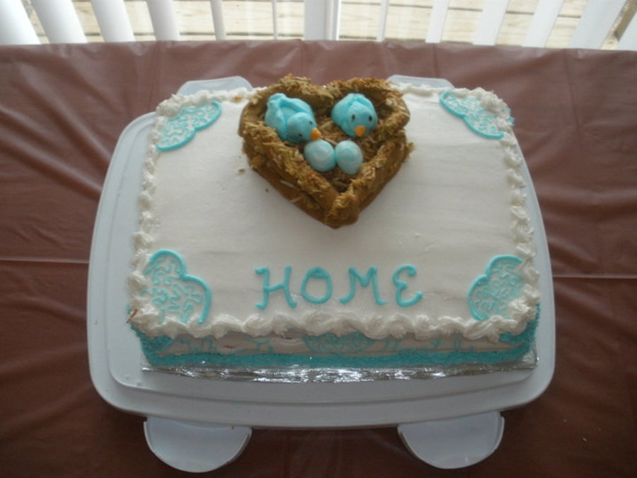 Not from a class, but my first cake not for immediate family. Made for a housewarming party for church. From scratch vanilla cake with vanilla buttercream and strawberry filling. Cornelli lace in corners and on front of cake. Nest is made from sugar cookies (colored brown) and toasted coconut, held together with brown buttercream. Birds and eggs handmade from buttercream thickened with powdered sugar. Not visible, but the front of the cake says "Where The Heart Is".