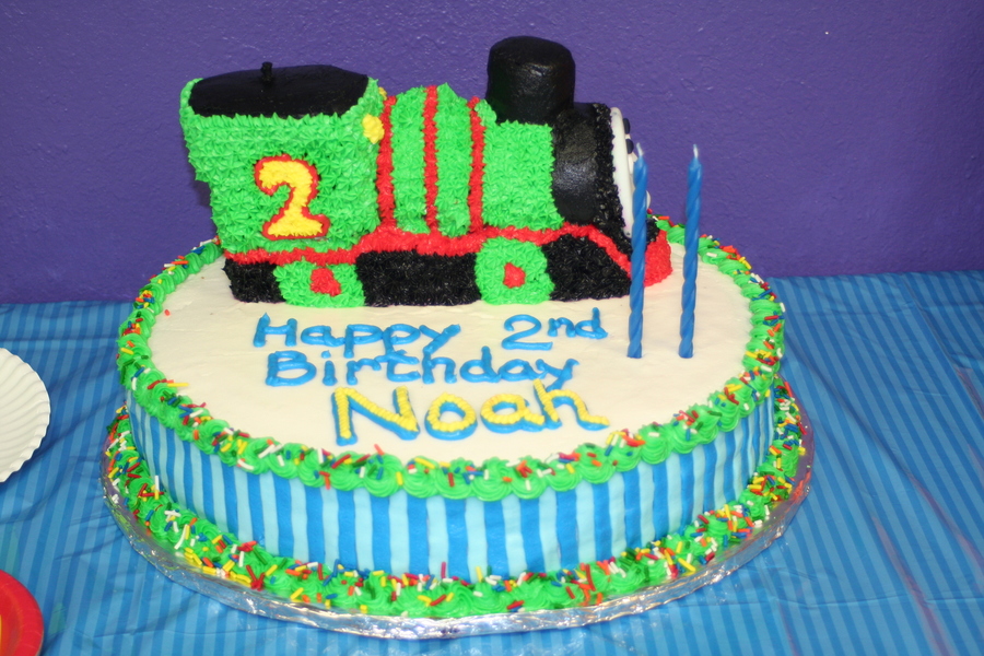 My son loved Thomas the train (actually he wanted Percy), so for his second birthday this is what I did. I had a 3-D train pain that was super easy to do. It took a while to make, but I think it turned out pretty cute. He loved it. It was a white cake with buttercream frosting. Percy is chocolate.