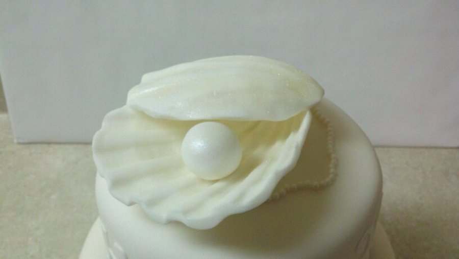 Dulce de leche cake with buttercream. Covered in MMF. All is edible except the ribbon. Seashell and pearl were made ahead of time to dry and painted with luster dust. Thank you to everyone on CC for inspiration. I believe I got the design from someone on this site but I cannot remember the name. If this is your original cake please let me know and I will give you credit!!! TFL!