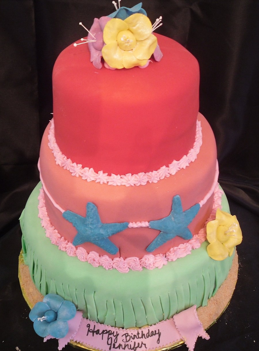 3 tier luau cake with handmade gum paste hibiscus flowers and starfish bikini top with grass skirt and sand.
