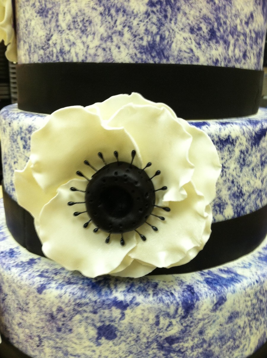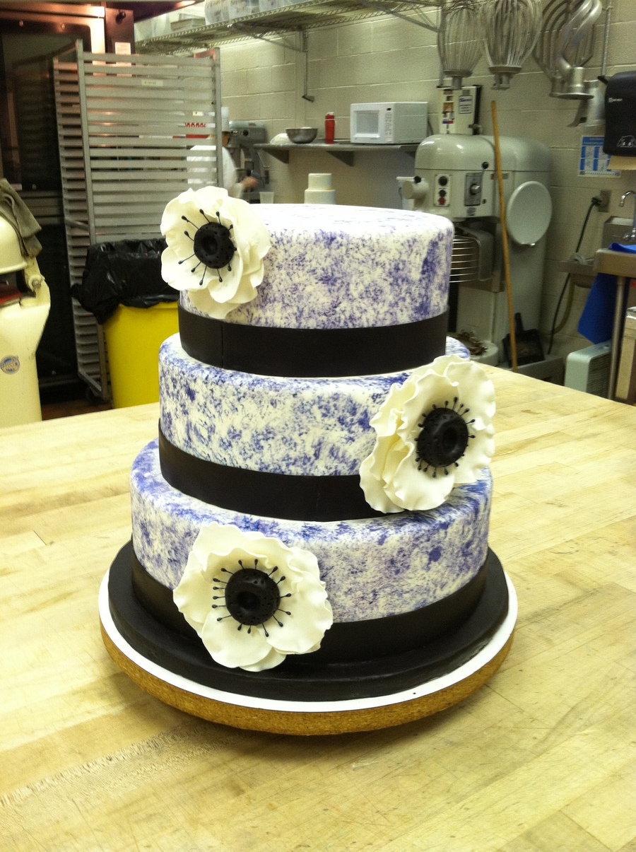 This is what I turned in for my Wedding Cake Class in Pastry Arts School.8,10,12 inch dummies. I used purple gel color for the sponge paint technique and the ribbon is black fondant. The anemone flowers are made out of gumpaste.