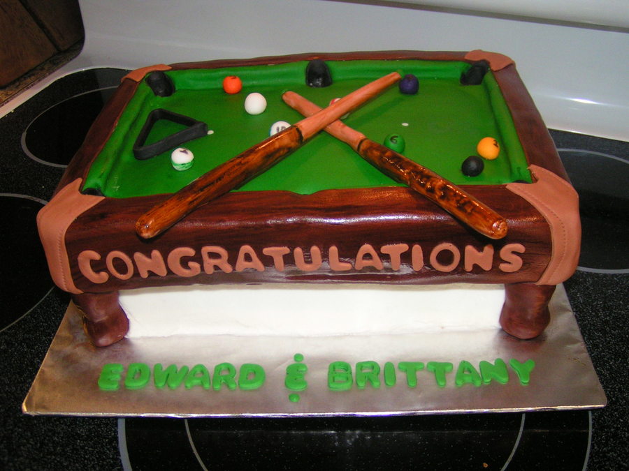 The groom's mother requested this to be served at the rehearsal dinner, since the bride and groom met in a pool hall! :) The bottom cake is chocolate with buttercream icing, and the top is vanilla butter cake with buttercream and fondant. I'm pleased with how it turned out, considering it was my first pool table.