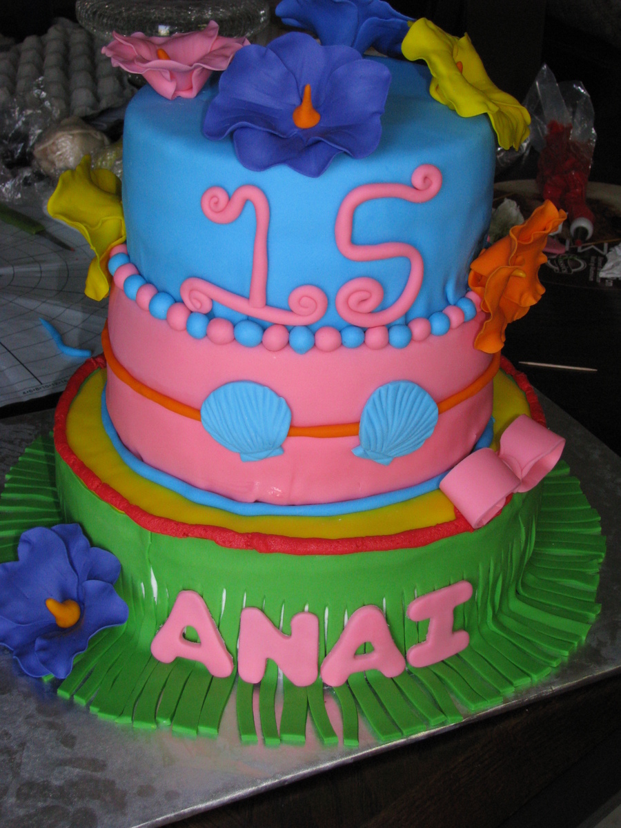 Cake was made for a 15th. B'day. Bottom was chocolate/oreo cookie. Middle was Vanilla/pinapple filling. Top layer was strawberry/strawberry buttercream filling. Flowers are fondant.