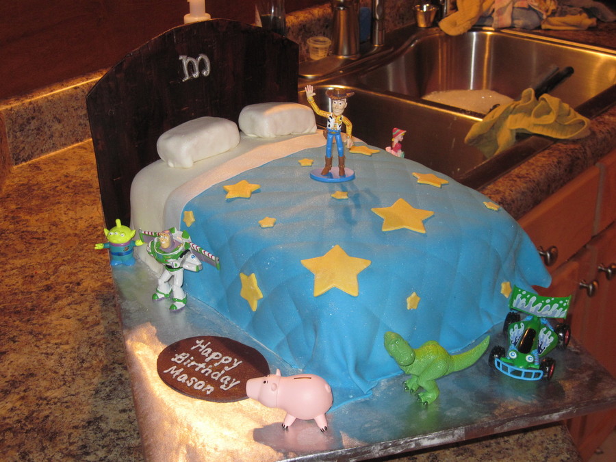 2 1/4 sheetcakes stacked frosted with buttercream frosting and covered in fondant. Used the quilted pattern roller to freehand the quilted pattern on the blue fondant to look like a quilt. Characters were bought at the disney store. Perfect size for what I needed. Headboard was made out of fondant and I pressed a woodfloor pattern onto it and brushed it with brown food coloring mixed with vodka to look like woodgrain. Had to use cardboard behind the headboard to make it stand. Probably could've used gumpaste, but have never used it before so I did it my way.