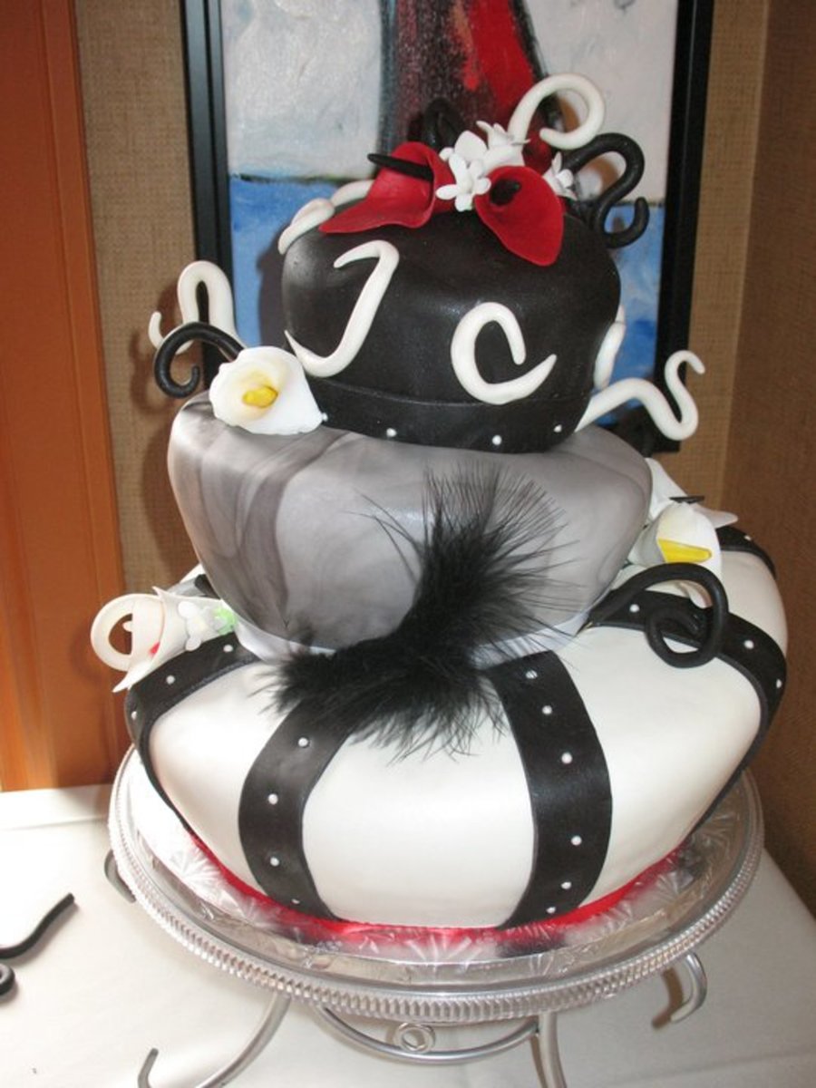 This was a cake requested by my good friend, Her colors were black, white and red and she wanted a topsy turvy funky style cake. This is what I came up with. She loved it and I had a blast making it :)