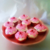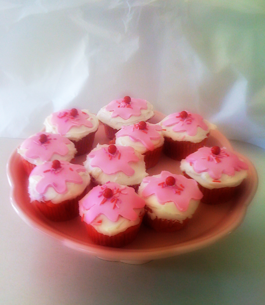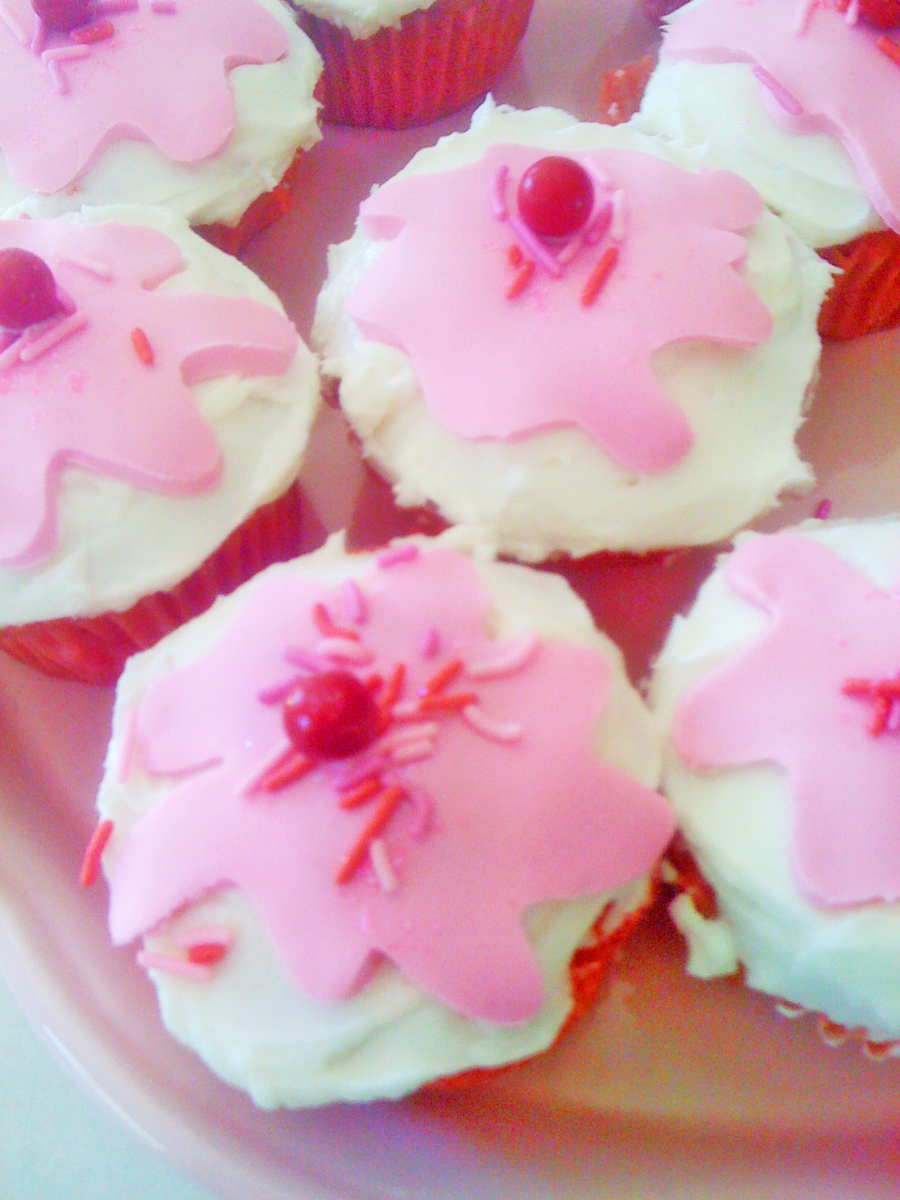 Fresh strawberry cupcakes with buttercream, pink fondant, sprinkles, and a red sixlet for garnish.