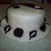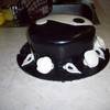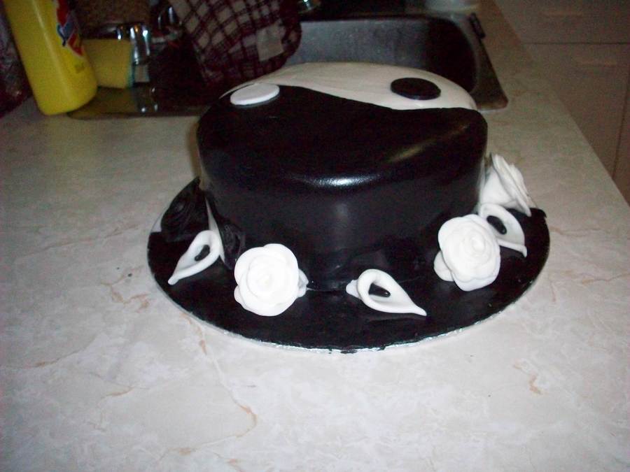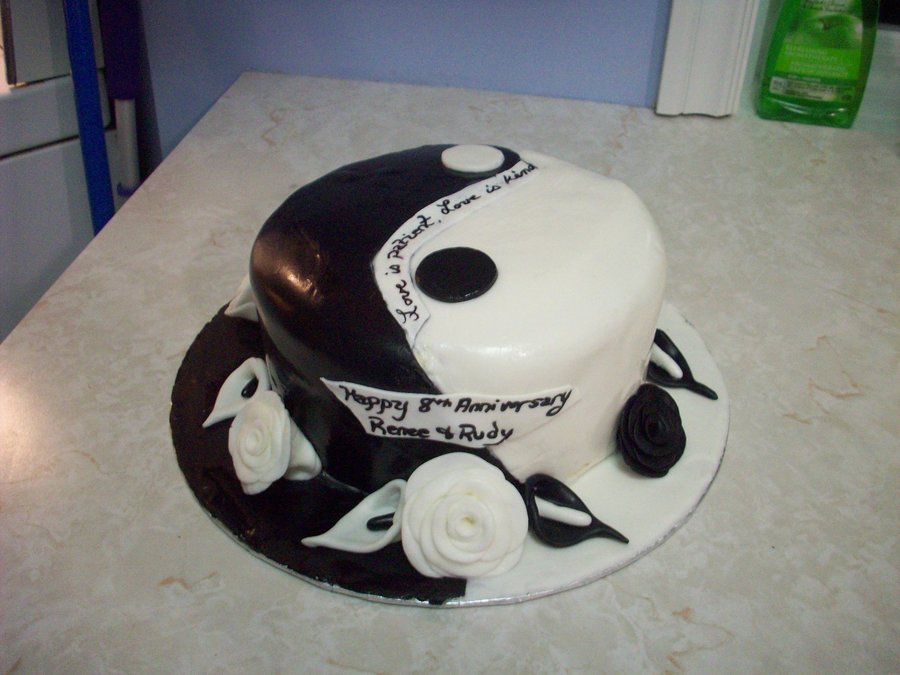 Yin and Yang Fondant Cake with Calla Lilies and Roses. A friend requested a cake to celebrate her wedding anniversary. I asked what her wedding colours were and she had an elegant black and white with theme. She had the Love is patient love is kind saying written on her wedding cake and the grooms cake (carrot cake) had a yin and yang symbol. Her flowers were calla lilies and roses. So this what I came up with for her 8th wedding anniversary cake.