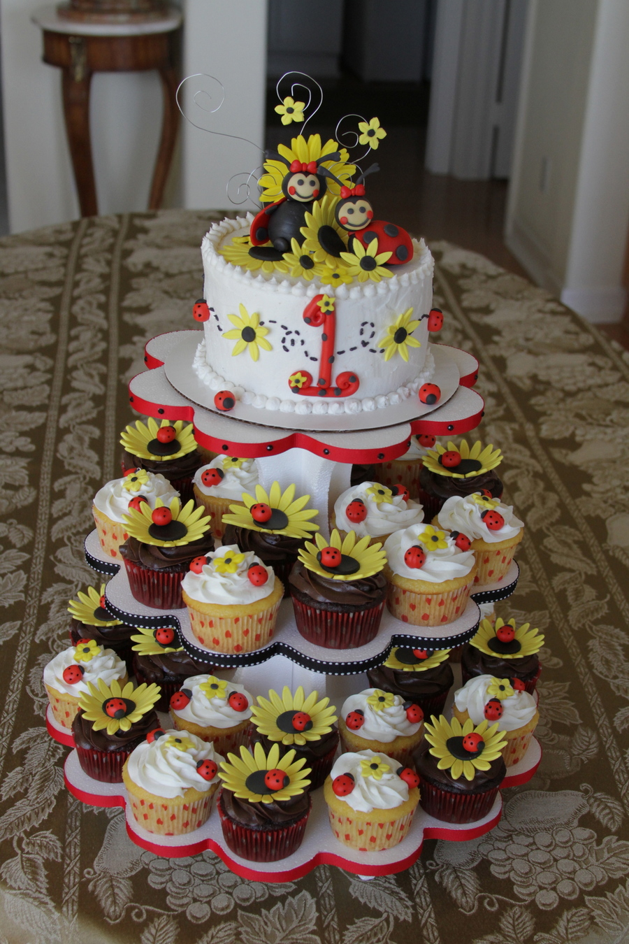 Lady bugs on top were inspired by other cakes seen on CC