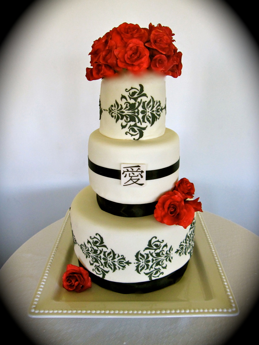 This is a mini wedding cake (9", 6" 4") with royal icing stencilling. It was the first time that I have stencilled and so I definitely learned a few things, including the fact that small tiers are much harder to do! The bride is Japanese so we incorporated the symbol for love on the plaque which was done free hand. The roses were made of gumpaste. Thank you to CC member Cambo for the inspiration!