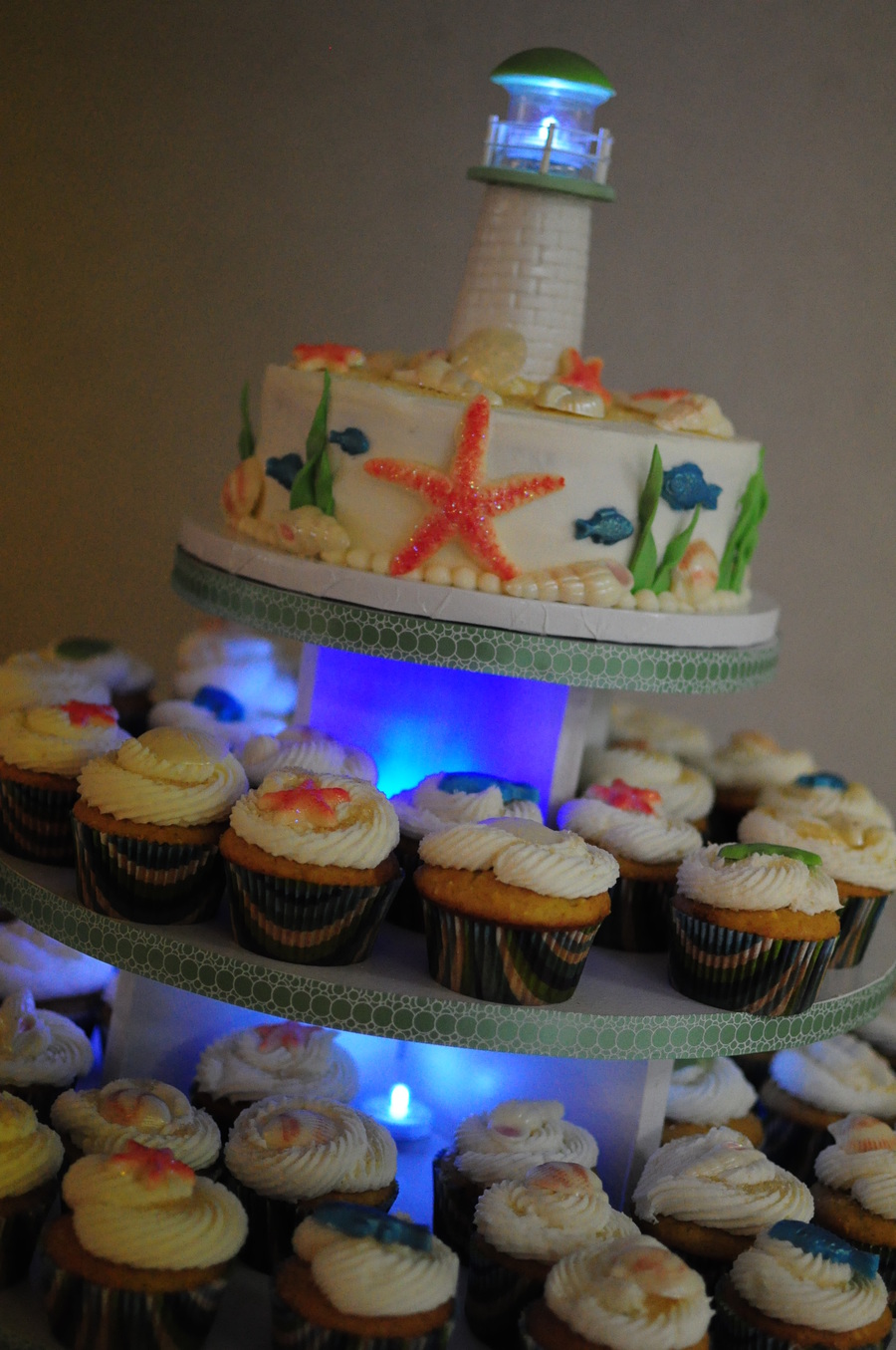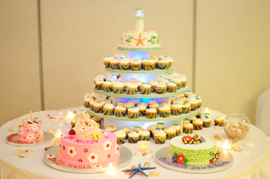 Made for a party in honor of my mother. Pina colada BC cake with gumpaste lighthouse, white choc seashells.
