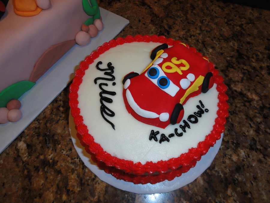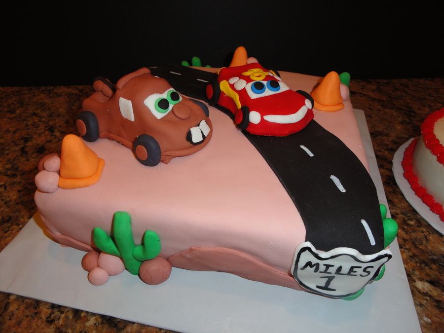 You knew it was coming, it's a Cars summer. Lightning and Mater are from the new Williams Sonoma pan of all the Cars 2 characters, they are fondant covered. The base layer is just one 3 inch layer covered in fondant (w/ extra buttercream in between). The road and the road sign (his name is Miles and it's his 1st birthday) are painted with food coloring. All decorations are fondant. The smash cake is buttercream decorated (except for the additional Lightning McQueen).